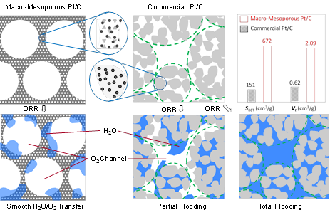 燃料电池被认为是继水力、火力、核能之后的第四代发电装置,具有替代内燃机的潜力,是电动汽车的理想动力,但受催化剂、质子交换膜和水热管理等技术成熟度的限制,尚未得到全面应用。水管理是决定燃料电池效率和稳定运行的三个关键因素之一。传统Pt/C催化剂的孔道由颗粒紧密堆积产生的间隙构建而成,能够用于传质的孔体积有限,容易水淹造成气体传输不畅。团队基于软硬模板法制备的有序大孔-介孔互穿网络耐水淹气体多孔电极,大孔排布规则有序,将孔体积容量提高到传统Pt/C颗粒密堆积电极的3.4倍,成为流体传输与存储的主通道;而由规则介孔构建的孔壁将其比表面积提高到传统Pt/C的4.5倍,是电极反应的主阵地。在单电极浸泡条件下,传统Pt/C不到一分钟就发生全面水淹从而停止工作,但大孔-介孔互穿网络耐水淹气体多孔电极则能够实现连续稳定长时间运行。因此孔道调控空前提高了气体多孔电极传质效率与抗水淹能力,在水管理上突破了传统电极材料的限制,为燃料电池迈向实际应用开拓了重要一步。