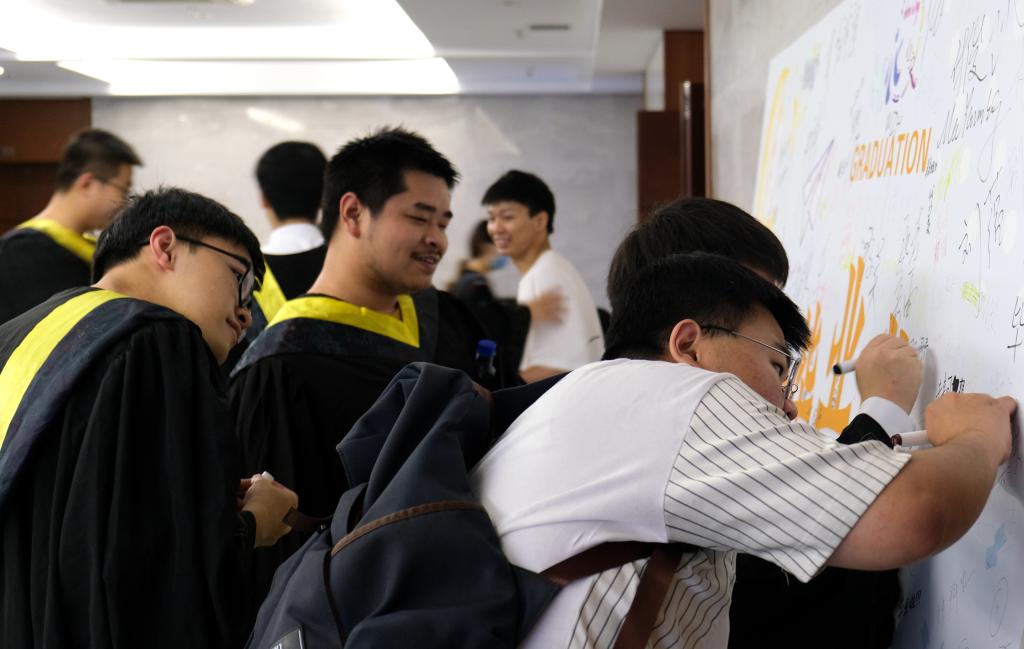 典礼前,到场师生在会场前进行签名留念,共同欣赏精心制作的毕业视频,一帧一画,记录了化院学子在重大的点滴生活,记录了自我成长与蜕变,记录了对校园生活的留恋不舍。本科毕业生孙润晨家长发来祝福寄语,祝愿化院学子前程似锦。