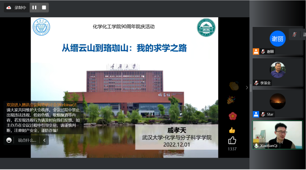 优秀校友戚孝天带来了《从缙云山到珞珈山:我的求学之路》的经历分享。党委副书记李泽全、部分校友、部分老师、本硕博各年级150余名学生一起参与了此次分享会。分享会由学办主任谢丽主持。