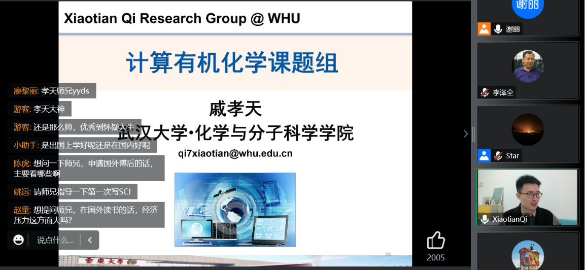 从本科到博士期间的美好学习时光、在美国匹兹堡大学的博士后工作经历、在武汉大学开展的科研探索进行讲述,他鼓励同学们对于学习、生活都要满怀热情,积极对待每一件事;树立清晰的目标,努力为之奋斗,创造属于自己的校友生活。交流环节中,同学们积极踊跃提问发言,在科研开展、出国留学、论文写作、学科发展、问题探索等多方面进行了交流。戚孝天结合自身经历,将他的理解娓娓道来。很多时候,由于各种原因,处于当下的我们对于行动的抉择感受“步步难”,时过境迁后,回顾过去经历,原来尽是“步步佳”,要相信广阔天地,大有可为。