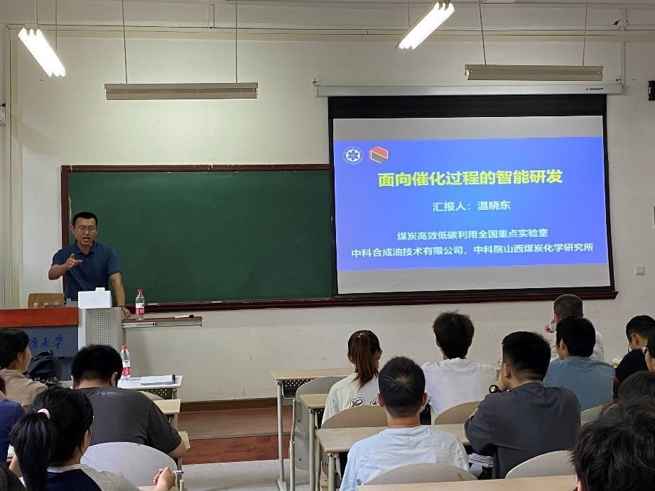 山西煤炭化学研究所的创建、发展历史,以无私奉献的老一辈科技工作者为实例,激发了同学们的爱国热情和责任感。然后,温晓东研究员深入浅出地介绍了自己的研究成果:针对铁基催化剂的结构演变问题,基于自主开发的智能平台,理论上实现了对铁基催化材料的物相结构和形貌的预测和甄别,实践中结合催化材料的性质表征和催化性能评价结果为工业催化剂的研发指明了方向。上述研究工作,可以看作是以国家需求为牵引、强化基础研究突破与积累的国家自主创新体系建设成果的典型范例。最后,温晓东研究员和师生进行了互动交流,和同学们深入讨论了研究中的具体专业问题、求学过程中的心态和学习方法等问题。报告会在热烈的掌声中结束。