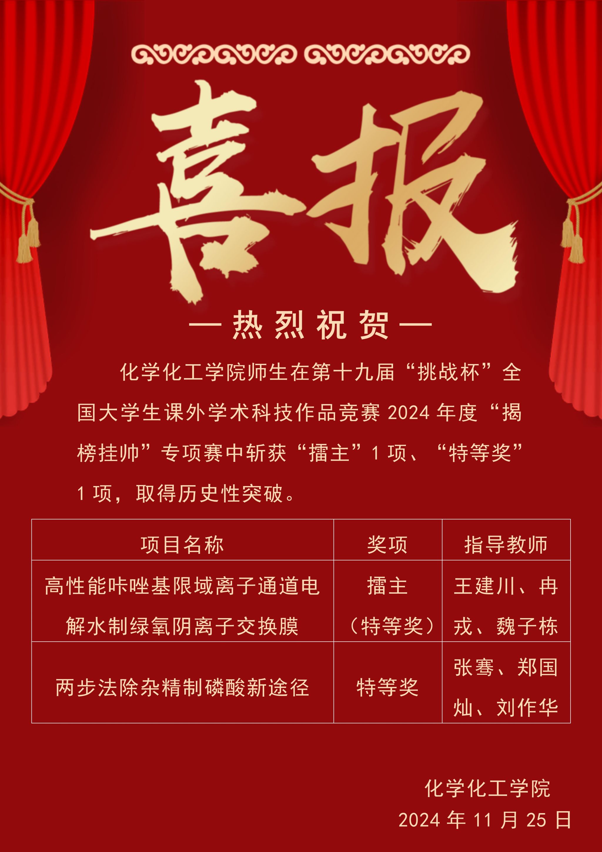 热烈祝贺中文无码 师生在第十九届“挑战杯”全国大学生课外学术科技作品竞赛2024年度“揭榜挂帅”专项赛中斩获佳绩