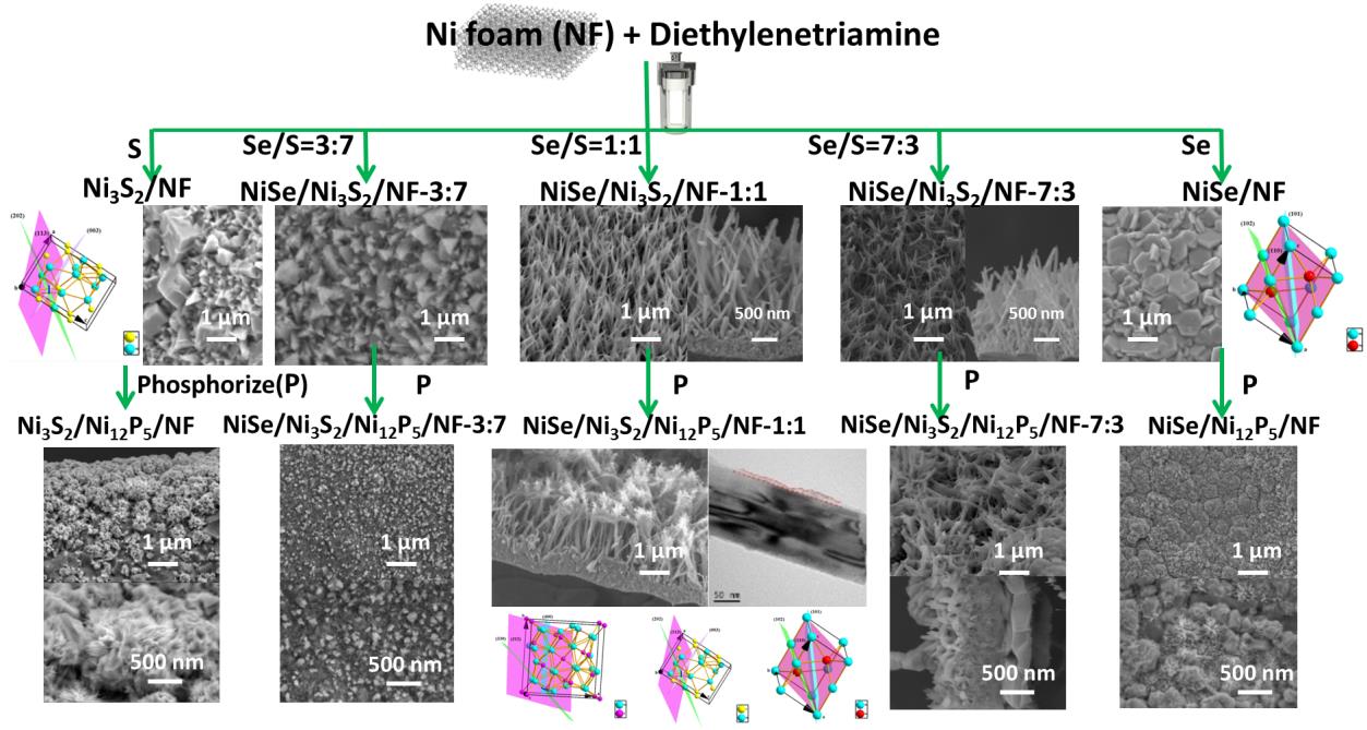 本研究中,龚云教授课题组利用简单的一步溶剂热法在泡沫镍基底上成功构建了高负载量(8.5 mg cm-2)的垂直生长的自支撑的硒化镍/二硫化三镍(NiSe/Ni3S2)纳米纤维阵列,通过进一步磷化处理,得到了NiSe/Ni3S2/Ni12P5异质结。由于这些活性组分的晶面相互匹配,电子密度在整个异质结构中重新分配,其能有效地进行电子传输和电荷转移。同时它们和集流体的晶面匹配,该自支撑的纳米纤维阵列具有刚性和耐久性。该材料在10 mA cm-2电流密度下的比电容为2.04 mAh cm-2 (在1 A g-1下,比电容为272 mAh g-1)。用其构建的混合电容器在20mA cm-2的电流密度下能提供7.26 mAh cm-3的高电容,在功率密度为84.8 mW cm-3时能提供了9.23 mWh cm-3的能量密度。该器件同时具有很好的循环稳定性,5000次充放电循环后,容量保持率为86 %。该研究为开发大负载混合电容器提供了新的思路。