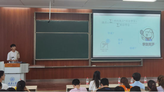 ,他介绍了自己四年的成长经历,建议大家学习之余也要适当放松;着重强调学习成绩以及绩点排名对保研的重要性,并且介绍了考研的流程及时间安排,为部分无法保研的同学提供指导建议。