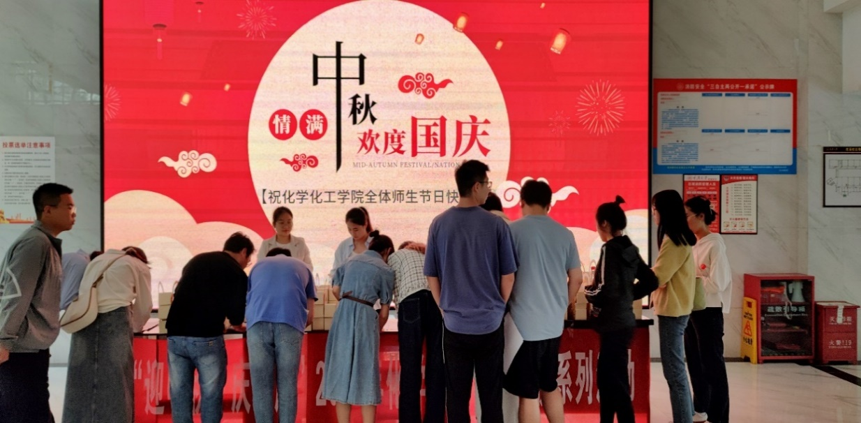统一采购了一批月饼,免费发放到同学们手中,让独自在外求学的学子们在中秋团圆佳节中感受到来自化院大家庭的温暖。
