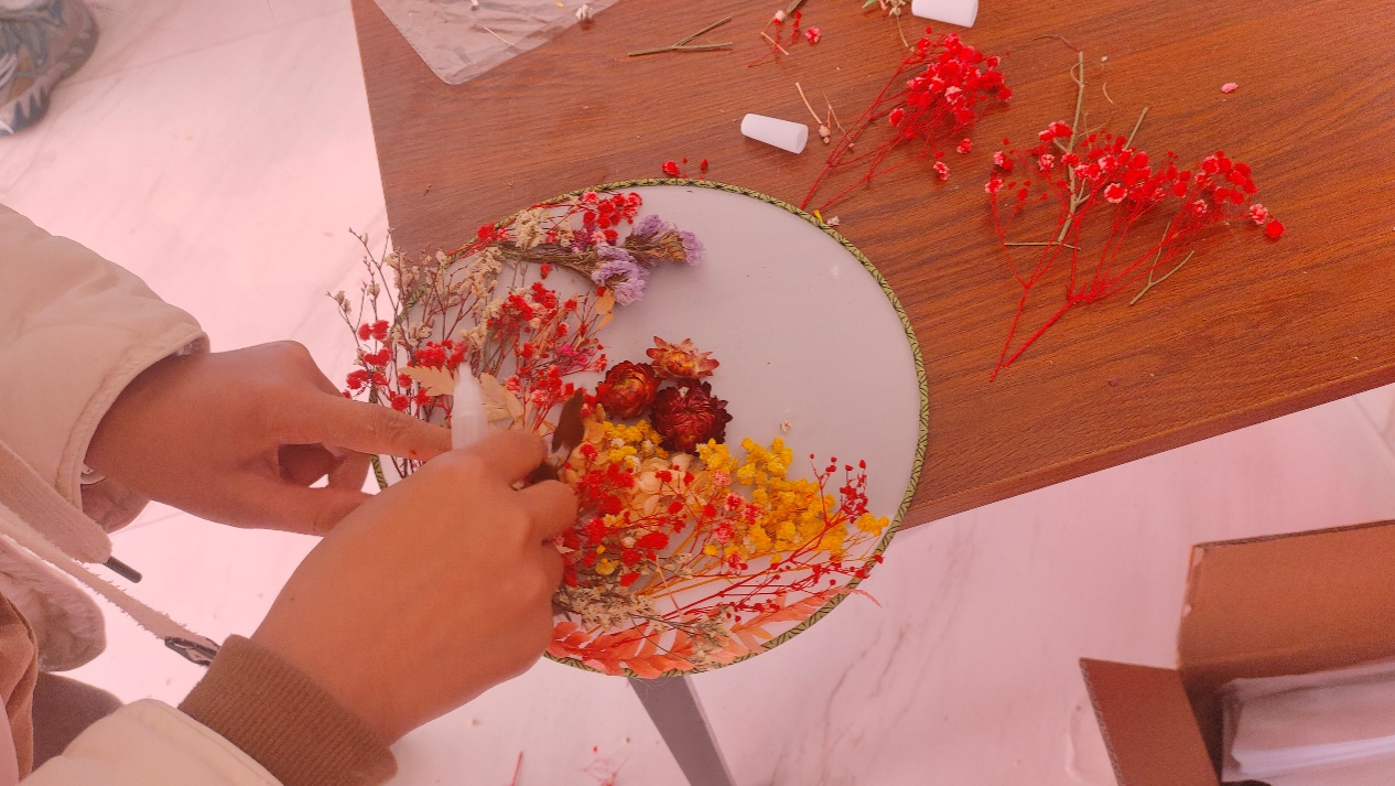 活动现场气氛热烈,用一枚别致的发簪记录你的独特旅程,让每一天都有故事可讲。各色花瓣组合,在发髻间绽放出一朵朵花。将各式花材排列组合,发挥创造力,制作出属于自己的团扇。同学们经过自己的努力,一个个图案各异、别致漂亮的团扇、发簪在手中“诞生”了,欣赏着自己亲手制作的团扇、发簪,大家脸上纷纷洋溢着满意的笑容,这也寄托着大家对美的理解和对幸福的感悟。