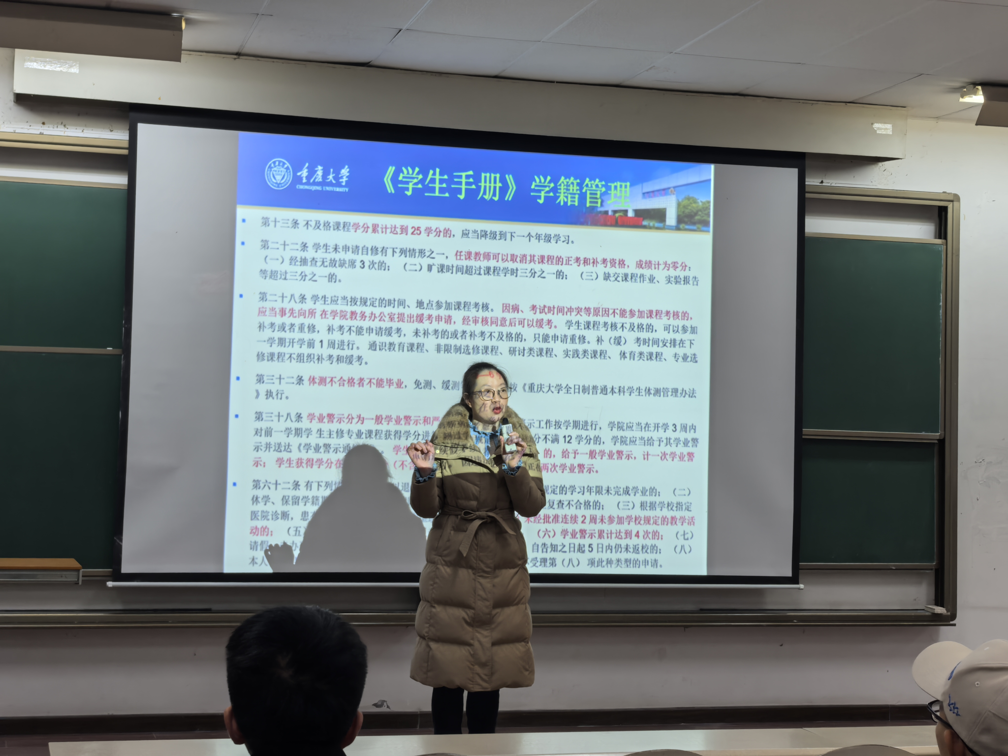 此外,伍丽以《学生手册》中学籍管理部分的内容为例,向同学们详细解释了降级、学业警示开除学籍等学籍管理相关规定。她真切地希望大家认真学习,做好学业和职业规划,不要让未来的自己后悔莫及。