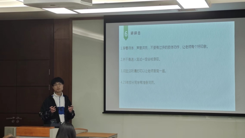 朱熙凤强调了熟练掌握专业课相关问题的重要性,并提醒大家提前准备专业英语面试相关内容。她指出了复试不仅是对专业知识的测试,更是对未来能否从事科研工作的考验。她特别提醒同学们在面试时注重着重礼仪,希望大家要保持自信、专注,放平心态,展现出良好的学术素养。